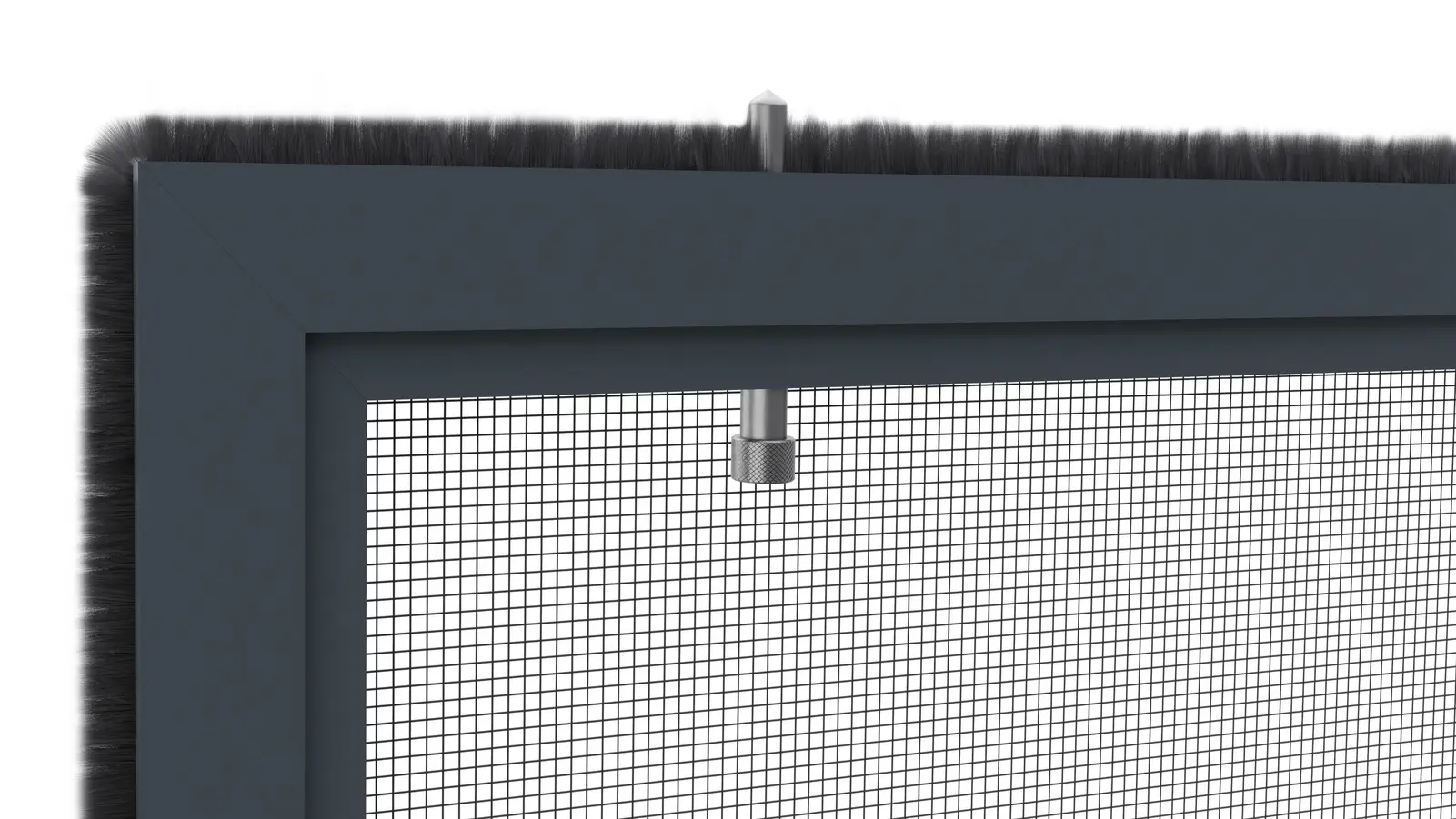 Bei der Federstiftmontage wird der Spannrahmen mithilfe integrierter Federstifte sicher und exakt in der lichten Öffnung des Fensters oder der Rollladenführungsschiene fixiert. Die präzise Ausrichtung erfolgt über spezielle Einschlaghülsen, die für eine saubere Zentrierung sorgen. Zum Ein- oder Aushängen genügt ein leichtes Zurückziehen der Federstifte – einfach in der Handhabung, stabil im Halt.